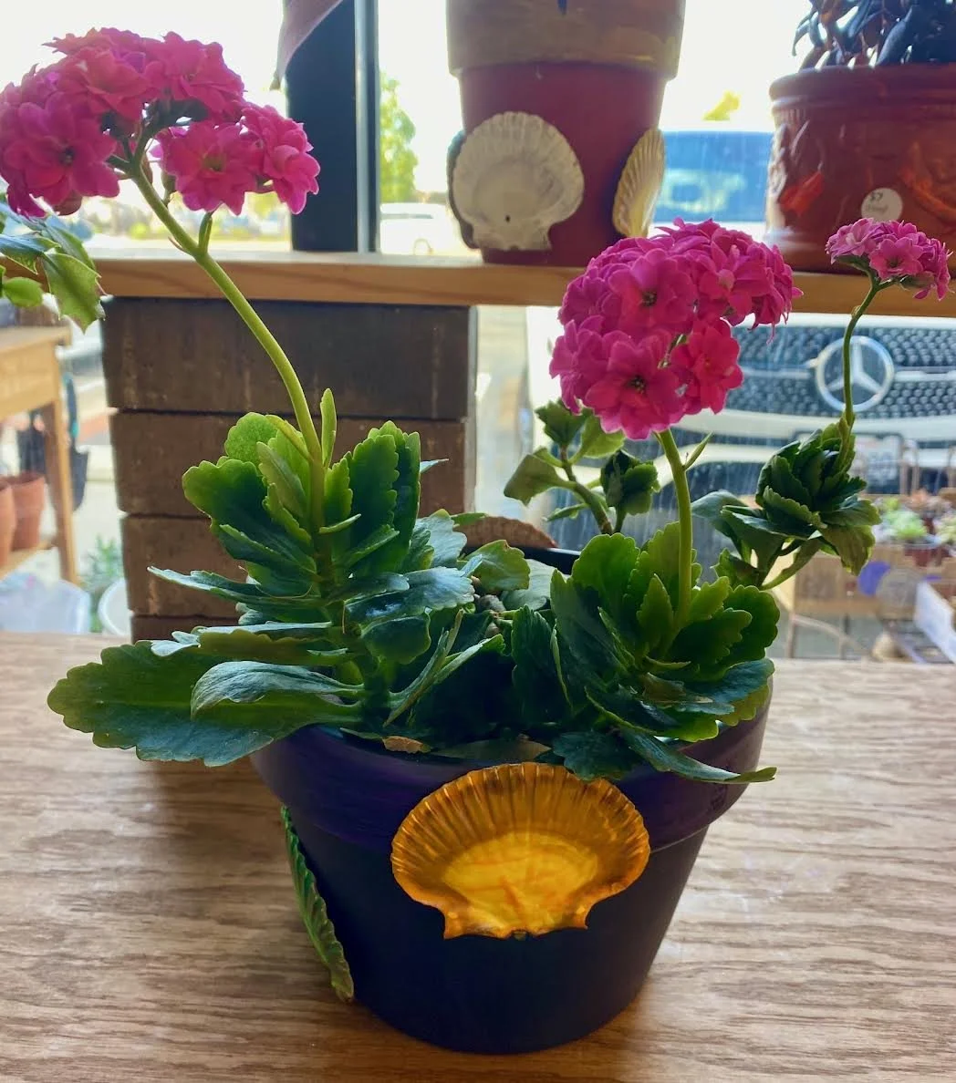 “Painting shells reminds me of good memories at the ocean and good memories of the beach. I choose colors inspired by how I’m feeling when I do art. Painting makes me happy and i feel proud of my creations. I hope others will care for the plants that live in the pots I have decorated with fabulous shells!”